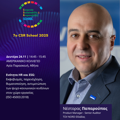 Συμμετέχοντας την ενότητα "HR & ESG" και εκπροσωπώντας την TÜV NORD Ελλάδας, ο κ. Νέστορας Παπαρούπας, Product Manager - Senior Auditor της TÜV NORD, μίλησε για ένα θέμα με ιδιαίτερη σημασία: "Εκφοβισμός, Παρενόχληση, Θυματοποίηση, Αντιμετώπιση των Ψυχοκοινωνικών Κινδύνων στον Χώρο Εργασίας (ISO 45003:2018)".