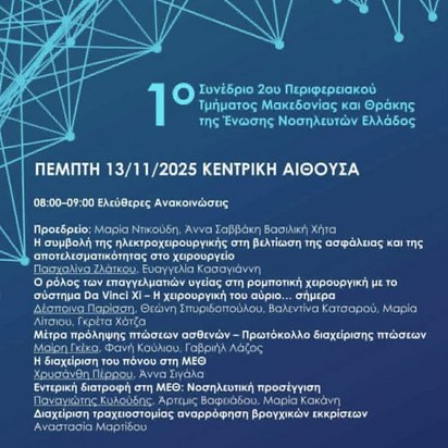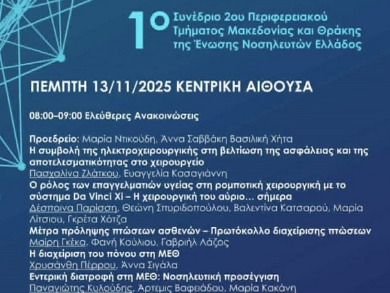 Το 1ο Συνέδριο του 2ου Περιφερειακού Τμήματος Μακεδονίας και Θράκης της Ένωσης Νοσηλευτών Ελλάδος (ΕΝΕ) πραγματοποιήθηκε την Πέμπτη 13 Νοεμβρίου 2025 στην κεντρική αίθουσα, συγκεντρώνοντας επαγγελματίες υγείας από όλη τη Βόρεια Ελλάδα. Το συνέδριο αποτέλεσε έναν σημαντικό χώρο επιστημονικού διαλόγου, ανταλλαγής εμπειριών και παρουσίασης καλών πρακτικών στον τομέα της νοσηλευτικής και της φροντίδας υγείας. Η θεματολογία του συνεδρίου επικεντρώθηκε σε κρίσιμα ζητήματα που αφορούν τη βελτίωση της ασφάλειας και της ποιότητας των παρεχόμενων υπηρεσιών υγείας, με έμφαση τόσο στην κλινική πρακτική όσο και στη σύγχρονη οργάνωση των δομών υγείας. Κατά τη διάρκεια των εργασιών παρουσιάστηκαν εισηγήσεις και ελεύθερες ανακοινώσεις που κάλυψαν ένα ευρύ φάσμα θεμάτων, όπως η πρόληψη πτώσεων ασθενών, η διαχείριση του πόνου στη ΜΕΘ, η εντερική διατροφή, η φροντίδα ασθενών με τραχειοστομία, καθώς και οι εξελίξεις στη χειρουργική και στη χρήση νέων τεχνολογιών. Ιδιαίτερο ενδιαφέρον παρουσίασε το πάνελ συζήτησης με θέμα «Ασφάλεια ασθενών και ποιότητα στην υγεία: προκλήσεις – προβληματισμοί – εξελίξεις», το οποίο ανέδειξε τη σημασία της διεπιστημονικής συνεργασίας και της συνεχούς εκπαίδευσης των επαγγελματιών υγείας, ως βασικών παραγόντων για τη δημιουργία ενός ασφαλούς και αποτελεσματικού συστήματος υγείας.