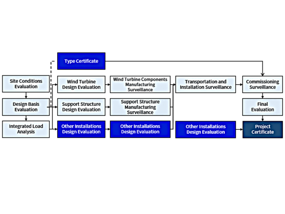 In a project certification it has to be approved for a specific site that type certified wind turbines and foundation designs meet requirements governed by site-specific external conditions and are in conformity with applicable local codes and other requirements relevant to the site. On the basis of applicable measurements and/or local standards the site specific external conditions, such as wind and wave distribution, wind farm effects, earthquake and temperature conditions, (sea-)ice, soil and electrical network conditions, have to be evaluated. Within the foundation design and installation evaluation the certification body observes by independent inspections – based on the certified specifications and manuals – the conformity of the foundations and support structures respectively the installation and commissioning procedures. Operation and maintenance surveillance is an optional module of the project certification and includes periodical inspections of the wind turbines and random checks of the maintenance procedures.