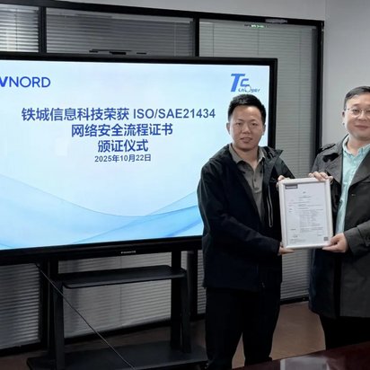 铁城信息科技运营副总赵勇进在颁证仪式上表示:“我们非常荣幸能够获得TÜV北德颁发的ISO/SAE 21434认证证书。网络安全是智能网联汽车发展的生命线。铁城信息科技始终将安全置于战略核心,积极践行功能安全、网络安全等国际标准。此次认证的通过,是对我们团队在网络安全领域系统性能力的认可,也坚定了我们持续为客户提供高安全性、高可靠性产品与解决方案的决心。未来,我们将继续与TÜV北德等权威机构深化合作,共同推动行业安全水平的提升。”