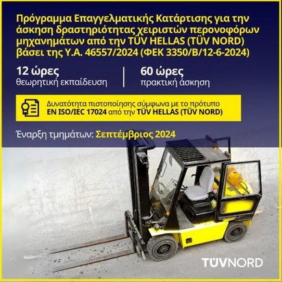 Η TÜV NORD HELLAS ανακοινώνει τη δυναμική συνέχεια του προγράμματος επαγγελματικής κατάρτισης για χειριστές περονοφόρων ανυψωτικών μηχανημάτων, προσφέροντας σε ενδιαφερόμενους επαγγελματίες την ευκαιρία να εκπαιδευτούν, να εξεταστούν και να αποκτήσουν τη σχετική άδεια, όπως προβλέπεται από τον νόμο 4982/2022.