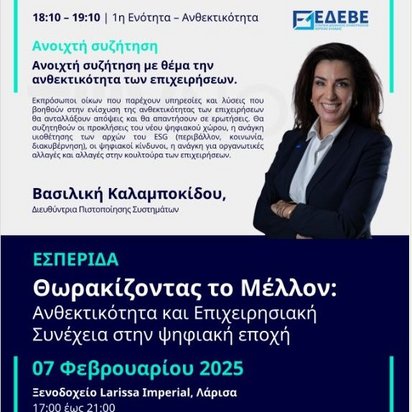 Η Ανθεκτικότητα και η Επιχειρησιακή Συνέχεια ήταν οι δύο βασικοί πυλώνες της Εσπερίδας με θέμα «Θωρακίζοντας το Μέλλον: Ανθεκτικότητα και Επιχειρησιακή Συνέχεια στην ψηφιακή εποχή», στην οποία συμμετείχε η κ. Βασιλική Καλαμποκίδου, Διευθύντρια Πιστοποίησης Συστημάτων του Φορέα μας.