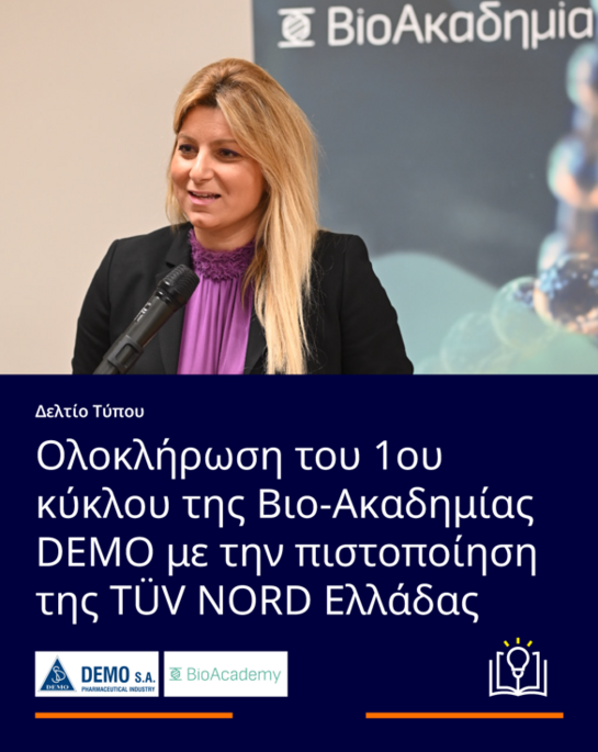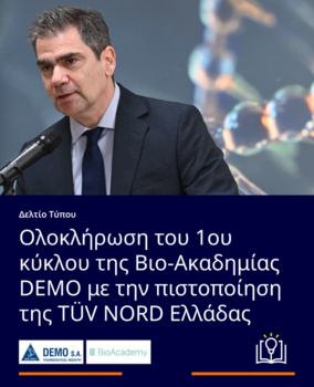 Την εκδήλωση που έλαβε χώρα στις επιβλητικές εγκαταστάσεις της φαρμακοβιομηχανίας χαιρέτισε ο κος Βασίλης Παρετζόγλου, Group Director – Corporate Development της DEMO ABEE, ο οποίος δήλωσε: «Με περηφάνια και συγκίνηση βρίσκομαι σήμερα ανάμεσα στους πρώτους αποφοίτους της Βιο-Ακαδημίας μας, ενός πρωτοποριακού project που οραματιστήκαμε σε ένα ρευστό περιβάλλον και υλοποιούμε στο δυναμικό σήμερα. Μου δίνει ιδιαίτερη χαρά, το γεγονός ότι η πλειοψηφία των αποφοίτων έχει ήδη αποδεχτεί τις προτάσεις συνεργασίας μας, και μαζί μας, θα ενώσουν τις δυνάμεις και τα όνειρά τους, ώστε να εργαστούμε όλοι μαζί για το μεγαλύτερο αγαθό όλων, την Υγεία».