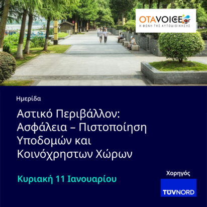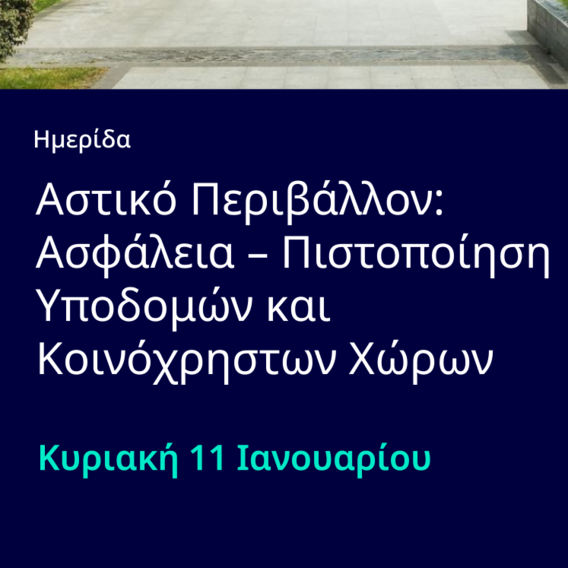 Ημερίδα με θέμα: «Αστικό Περιβάλλον: Ασφάλεια – Πιστοποίηση Υποδομών και Κοινόχρηστων Χώρων» η οποία θα διεξαχθεί την Κυριακή 11 Ιανουαρίου 2026 στις 11:00 πμ, στο Πνευματικό Κέντρο του Δήμου Ασπροπύργου.