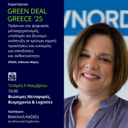 Η κα Βασιλική Καζάζη, συμμετείχε στο πάνελ με θέμα: «Βιώσιμες Μεταφορές, Βιομηχανία & Logistics», συμβάλλοντας στον διάλογο για την ενίσχυση της αποδοτικότητας, της αξιοπιστίας και της ανθεκτικότητας στις μεταφορές, τη βιομηχανική παραγωγή και την εφοδιαστική αλυσίδα.