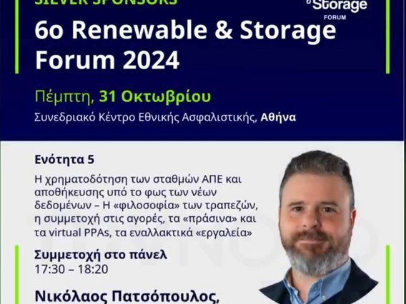 Από αύριο 31 Οκτωβρίου έως και την Παρασκευή 1η Νοεμβρίου στο Συνεδριακό Κέντρο Εθνικής Ασφαλιστικής, Λεωφόρος Συγγρού 103-105 θα πραγματοποιηθεί το φετινό Renewable and Storage Forum.