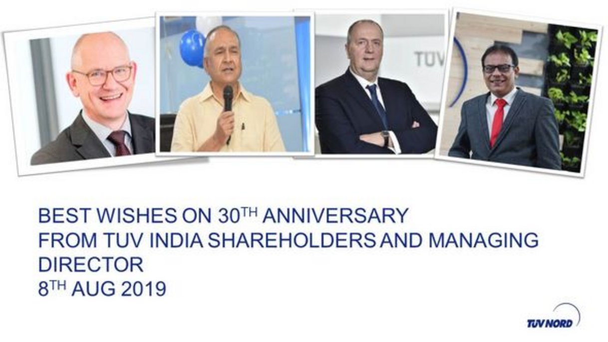 On the joyous occasion of TUV India 30th Anniversary our shareholders Dr Dirk Stenkamp , CEO of TUV NORD GROUP & Chairman of TUV India Board, Mr P N Kapdia, Director & Promoter TUV India, Dr Ralf Jung,Managing Director of TÜV NORD Systems GmbH & Co.Kg, TÜV NORD International GmbH & Co Kg , TUV India board member and our Managing Director Mr Manish Bhuptani extended best wishes to all Employees. We have captured all of them together at https://www.youtube.com/watch?v=n2-VEAIcP5M&feature=youtu.be
