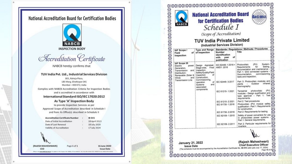 TUV India is pleased to announce being the first Inspection Body to receive the accreditation, Scope- 25 covering Electric power Generation, Transmission and Distribution- Renewable (Solar & Wind) and Transmission Line under ISO/ IEC 17020:2012, Conformity assessment — Requirements for the operation of various types of bodies performing inspection, Type A Inspection Body.