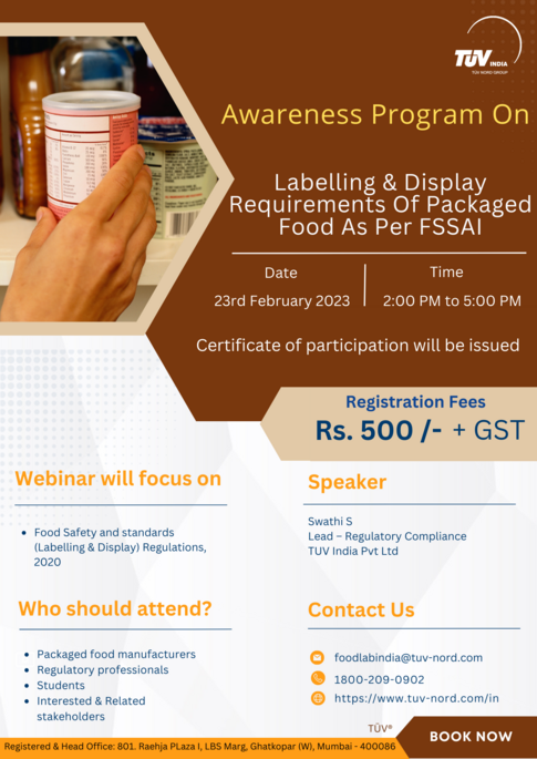 TUV India invites you to attend an awareness program on ‘Labelling & Display Requirements Of Packaged Food As Per FSSAI’, on 23rd February 2023 from 2:00 PM to 5:00 PM.