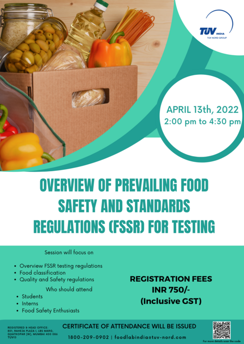 TUV India invites you to attend training program on topic "Overview Of Prevailing Food safety And Standards Regulations (FSSR) For Testing" on 13th April 2022 from 2.00 pm to 4.30 pm.