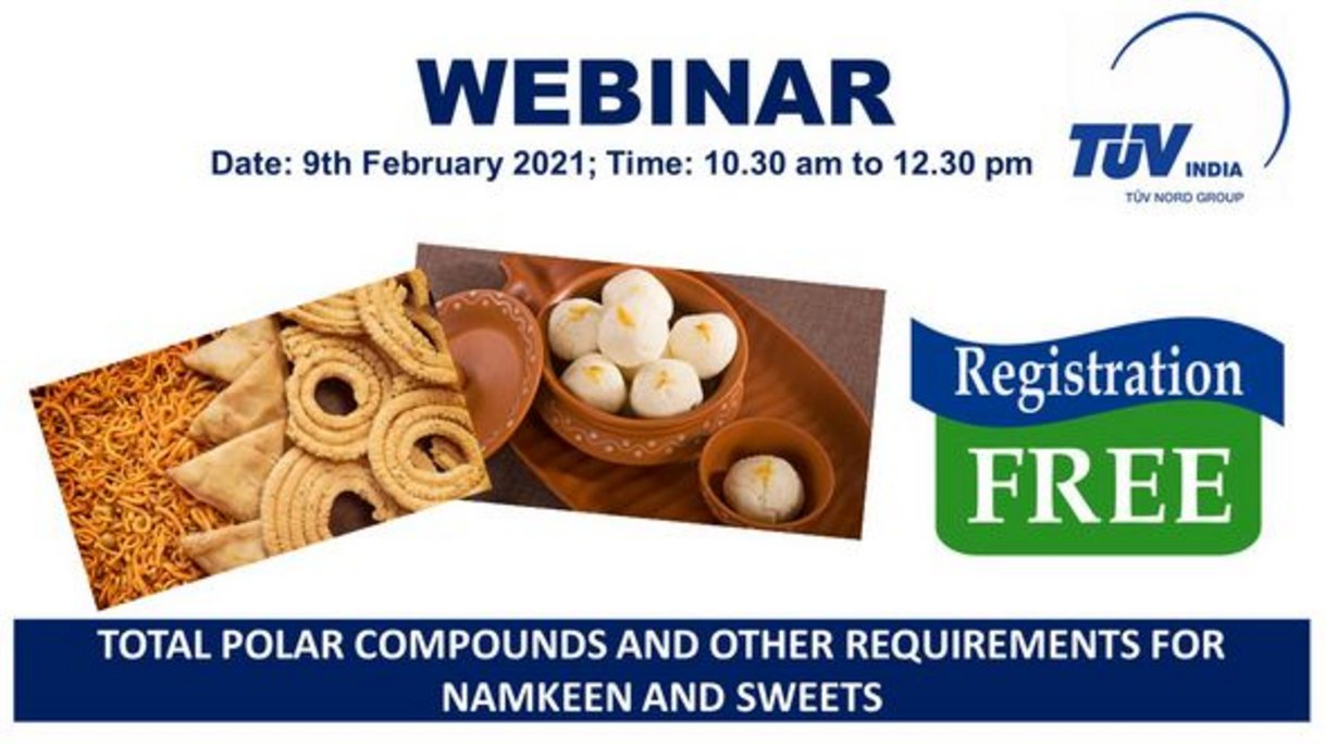 TUV India invites you to attend webinar session to discuss on the topic “Total polar compounds and other requirements for namkeen and sweets” on 9th February 2021from 10.30am to 12.30pm.
