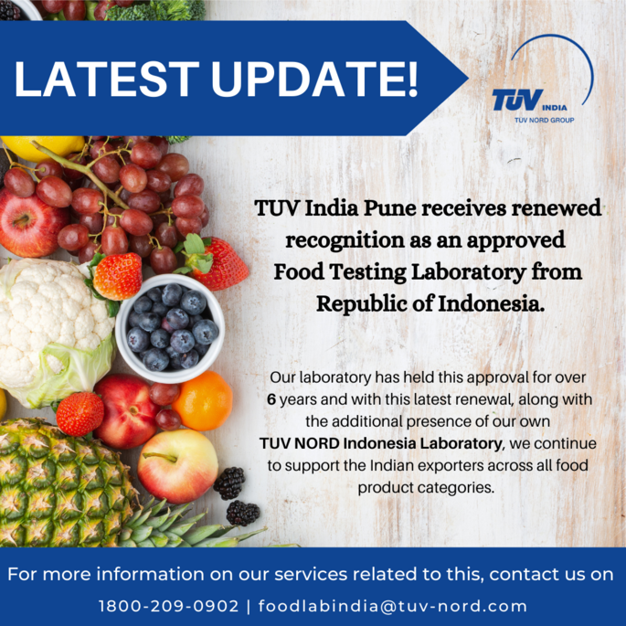 We are pleased to announce renewal of TUV India Pune Food Testing laboratory approval for export sample testing for Indonesia.