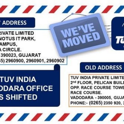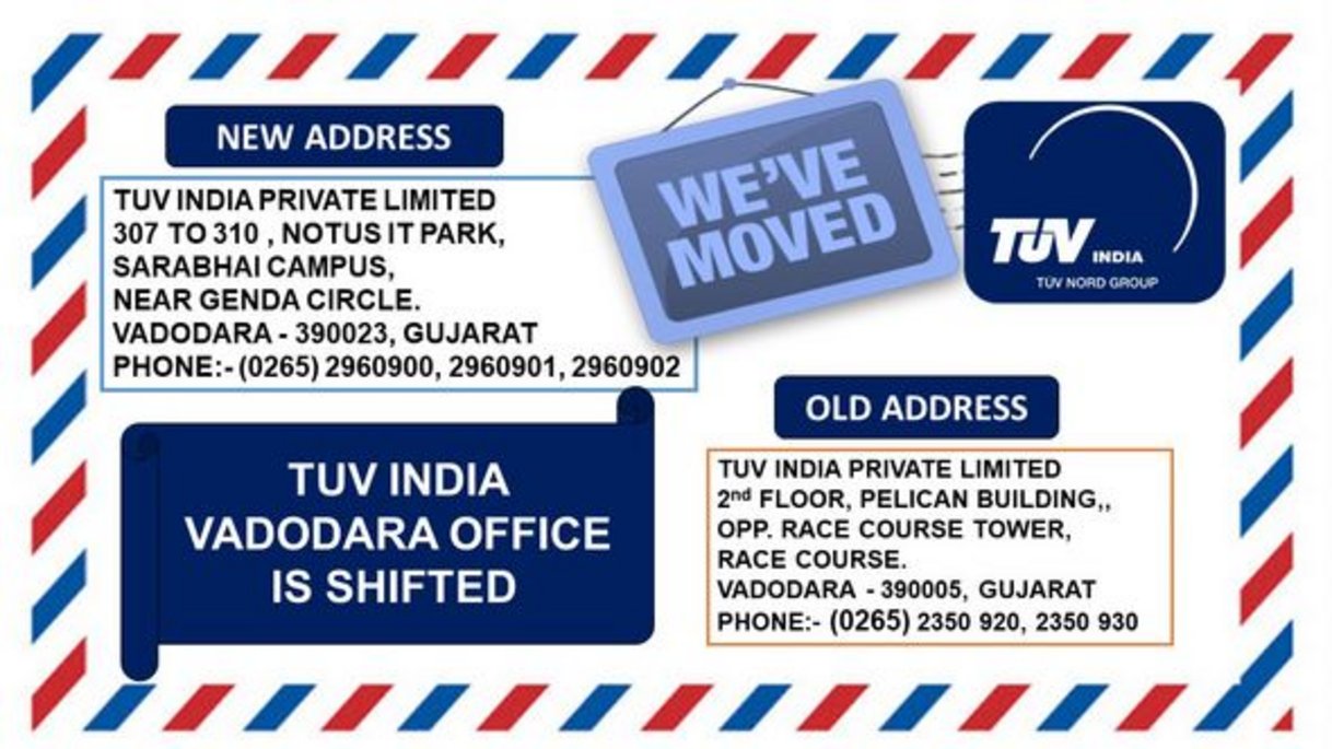 TUV India Vadodara Branch address and contact numbers will be changed as below effective from 16th March 2020 :
