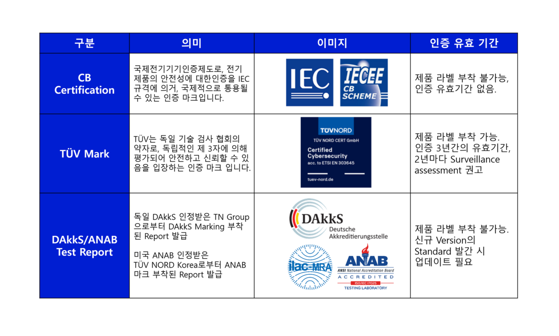 - TÜV NORD Korea: EN 18031-1, EN 18031-2, EN 18031-3 및 ETSI EN 303 645