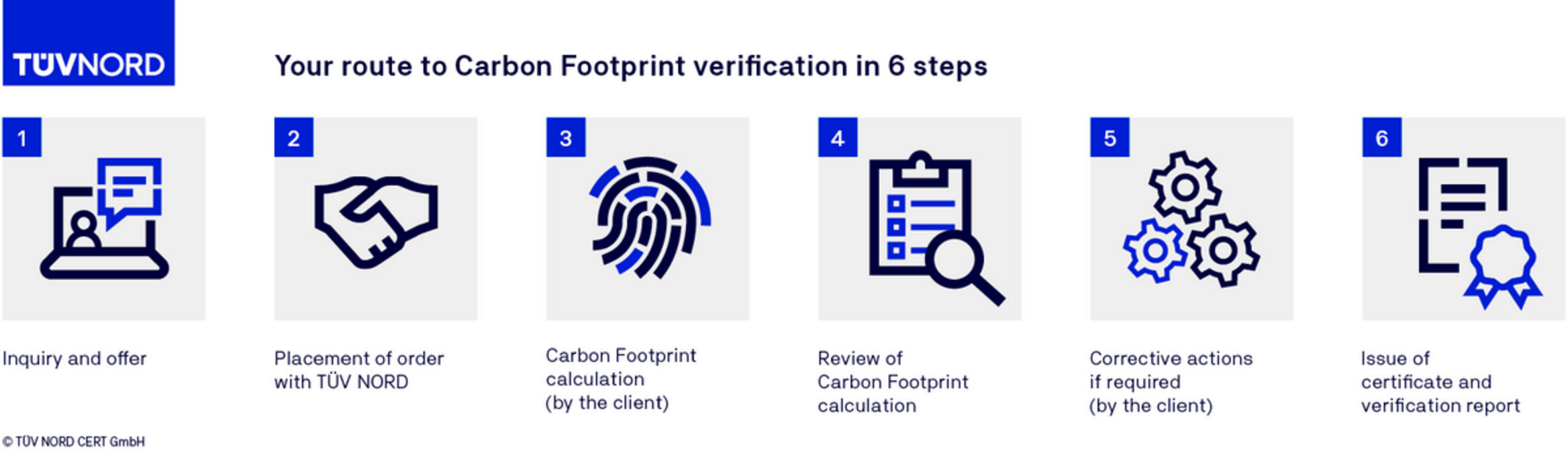 TÜV NORD CERT, DIN EN ISO 14064-3:2020 uyarınca doğrulamalar gerçekleştirme ve başarılı doğrulamanın ardından size karbon ayak izinize karşılık gelen bir sertifika verme konusunda akreditedir.