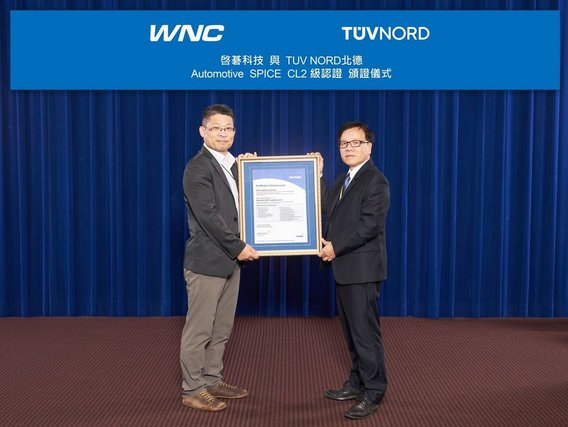 啓碁科技獲得 TUV NORD Taiwan(台灣北德)Automotive SPICE CL2 級認證,展現啓碁科技在車用軟體開發與品質管控皆達到業界領先標準。頒證儀式於啓碁科技總部舉行,由資深副總暨車用電子事業群總經理陳發裕先生代表公司接受 TUV NORD Taiwan 大中華區副總裁暨台灣分公司總經理葉政治先生頒發證書。