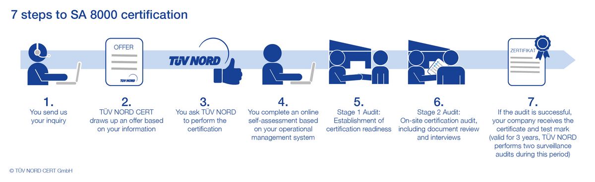 TUV NORD Taiwan北德代表TUV NORD CERT根據國際公認的SA 8000標準驗證社會責任,SA8000 將管理系統方法應用於社會績效,並強調持續改進--而不是清單式驗證。SA8000對企業的要求與 BSCI 標準相同,但包含與 ISO 9001 一致的管理系統。特別適用於活躍全球的公司以及產品供應商,無論其規模、產業或地點。