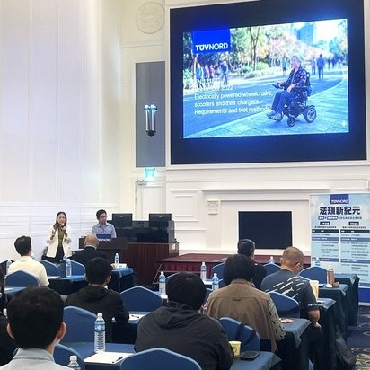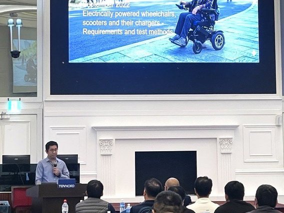 講座上半場以電動輪椅與代步車為主軸,說明進入歐盟市場時所需關注的法規要求及相關安全測試重點;下半場則針對即將實施的新機械法規進行解析,涵蓋製造商責任、功能安全,以及AI與資安相關議題,同時亦介紹EN ISO 13849-1 及 IEC 62443 等國際標準在整體合規架構中的定位,協助與會者從不同面向理解未來法規發展方向。