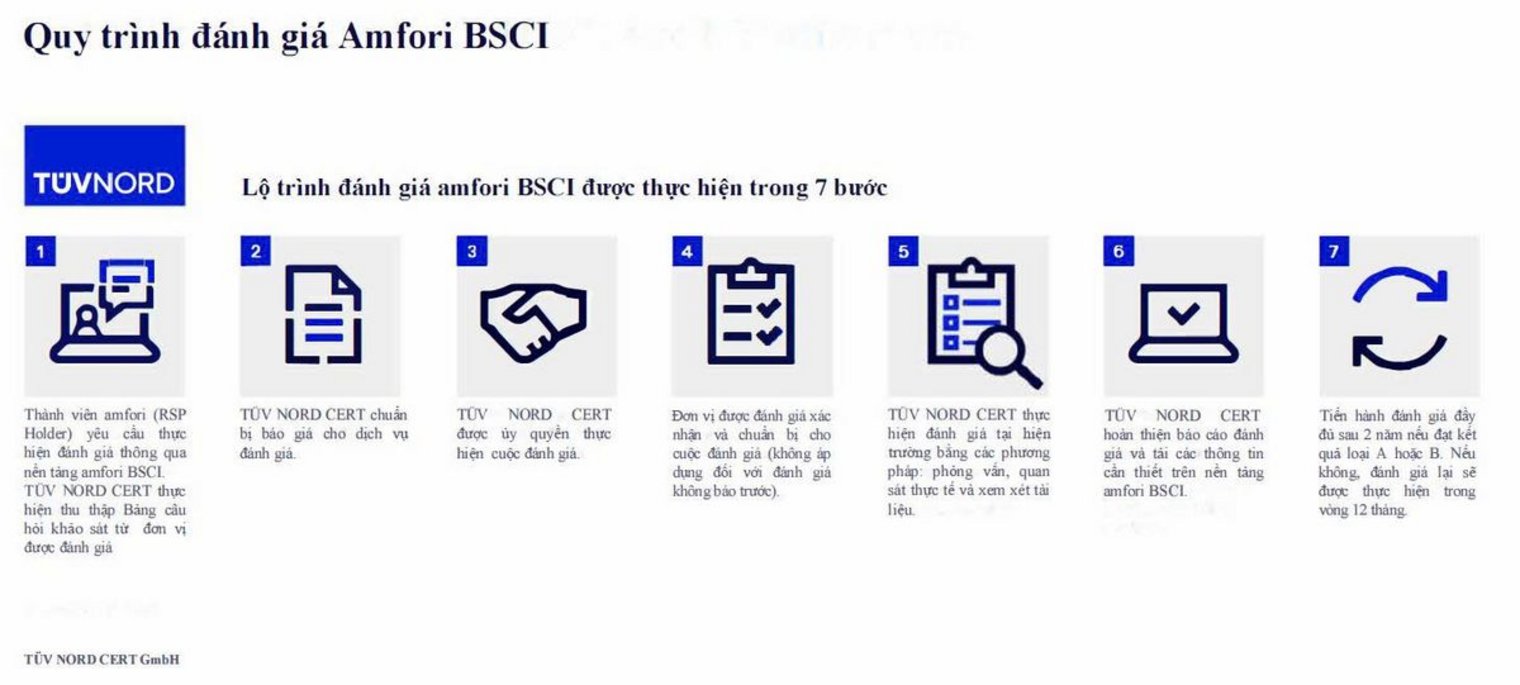 Việc áp dụng đánh giá theo tiêu chuẩn amfori BSCI (Business Social Compliance Initiative) giúp doanh nghiệp bảo đảm rằng các nhà cung cấp trong chuỗi cung ứng của họ tuân thủ các nguyên tắc về đạo đức, tôn trọng con người và bảo vệ môi trường. Đây là công cụ hiệu quả nhằm nâng cao hiệu suất xã hội và thiết lập một chuỗi cung ứng có trách nhiệm.